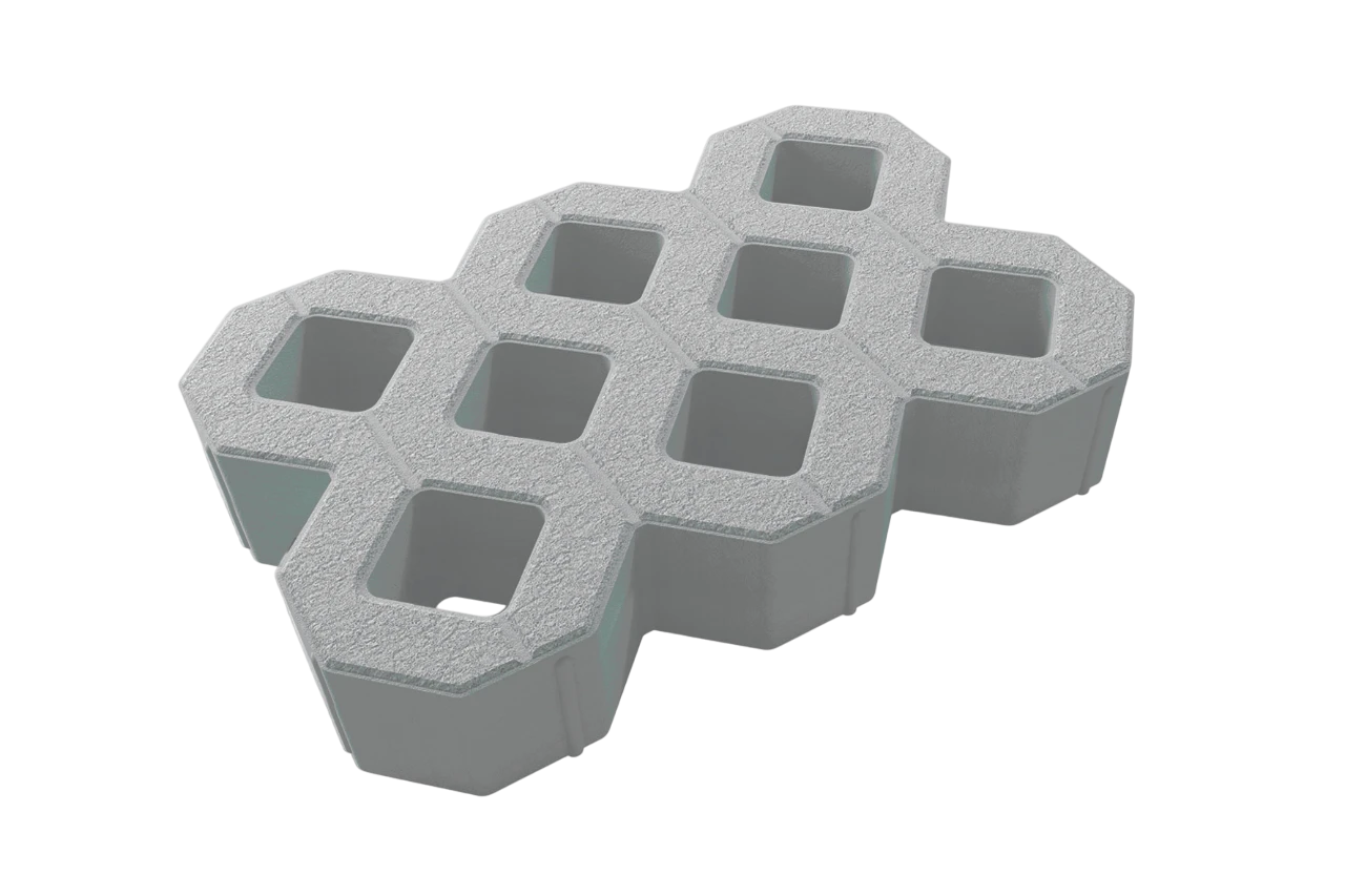 Прочные ровные наземные покрытия представляют собой вентилируемую и водопроницаемую бетонную решетку. Она укрепляет грунт, защищая от эрозии, позволяет сохранить корни и стебли естественно растущей травы или специально выращенного газона, по которым можно свободно ходить, ездить на велосипедах, автомобилях.