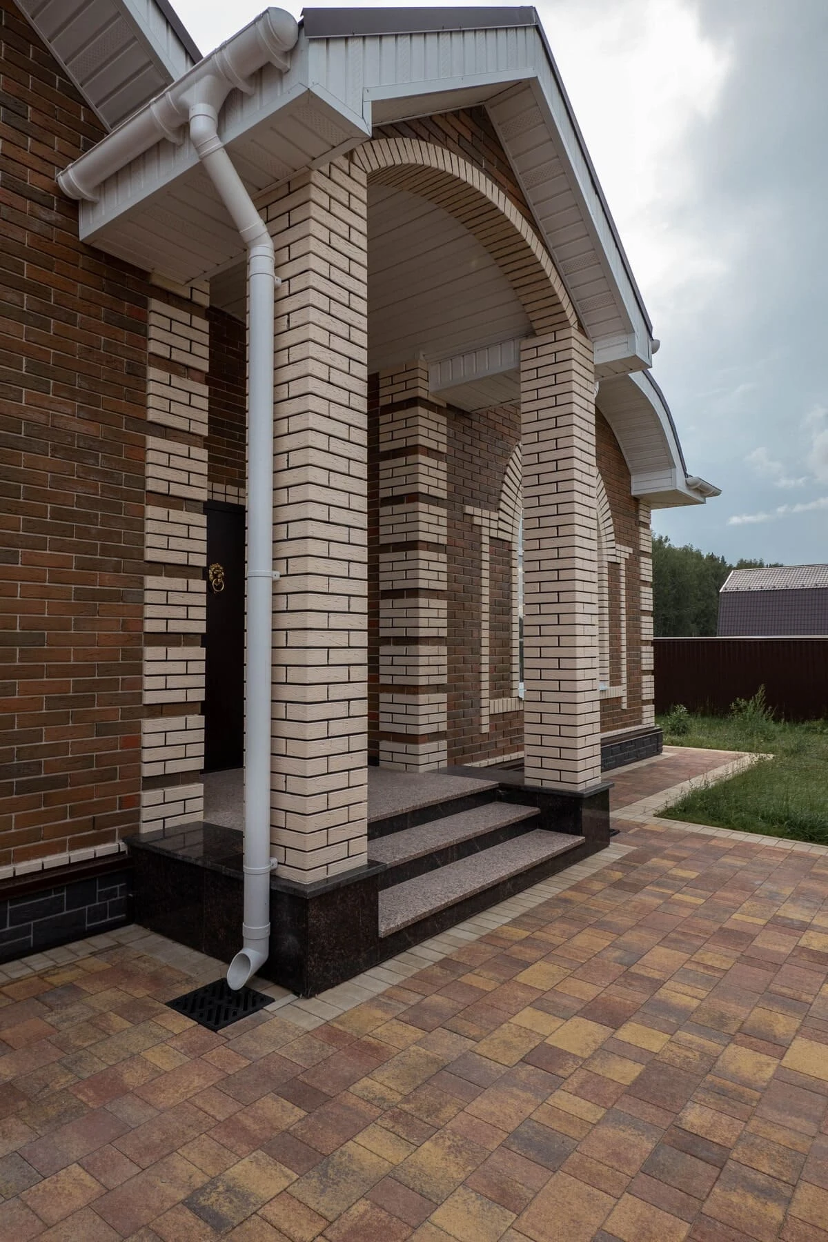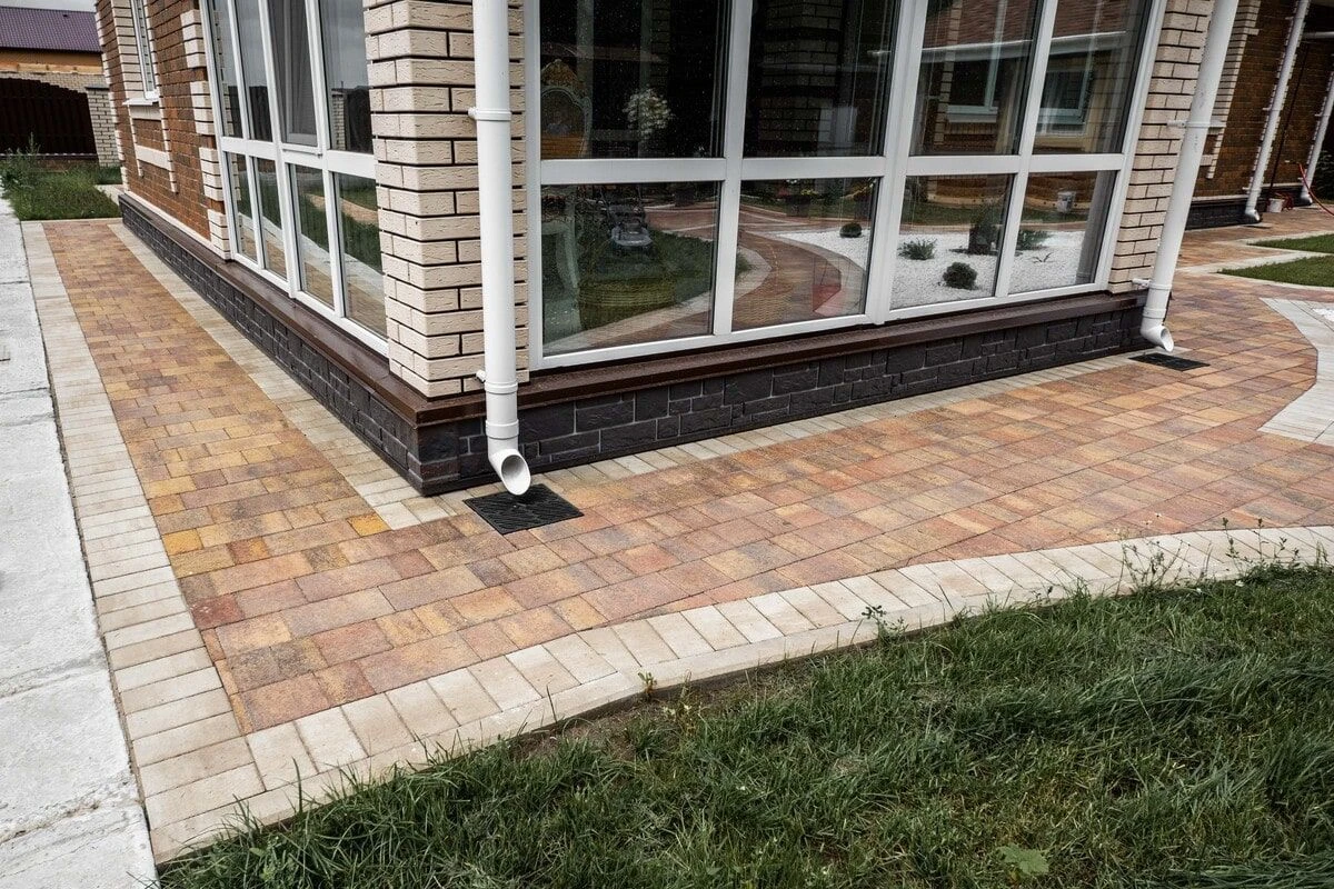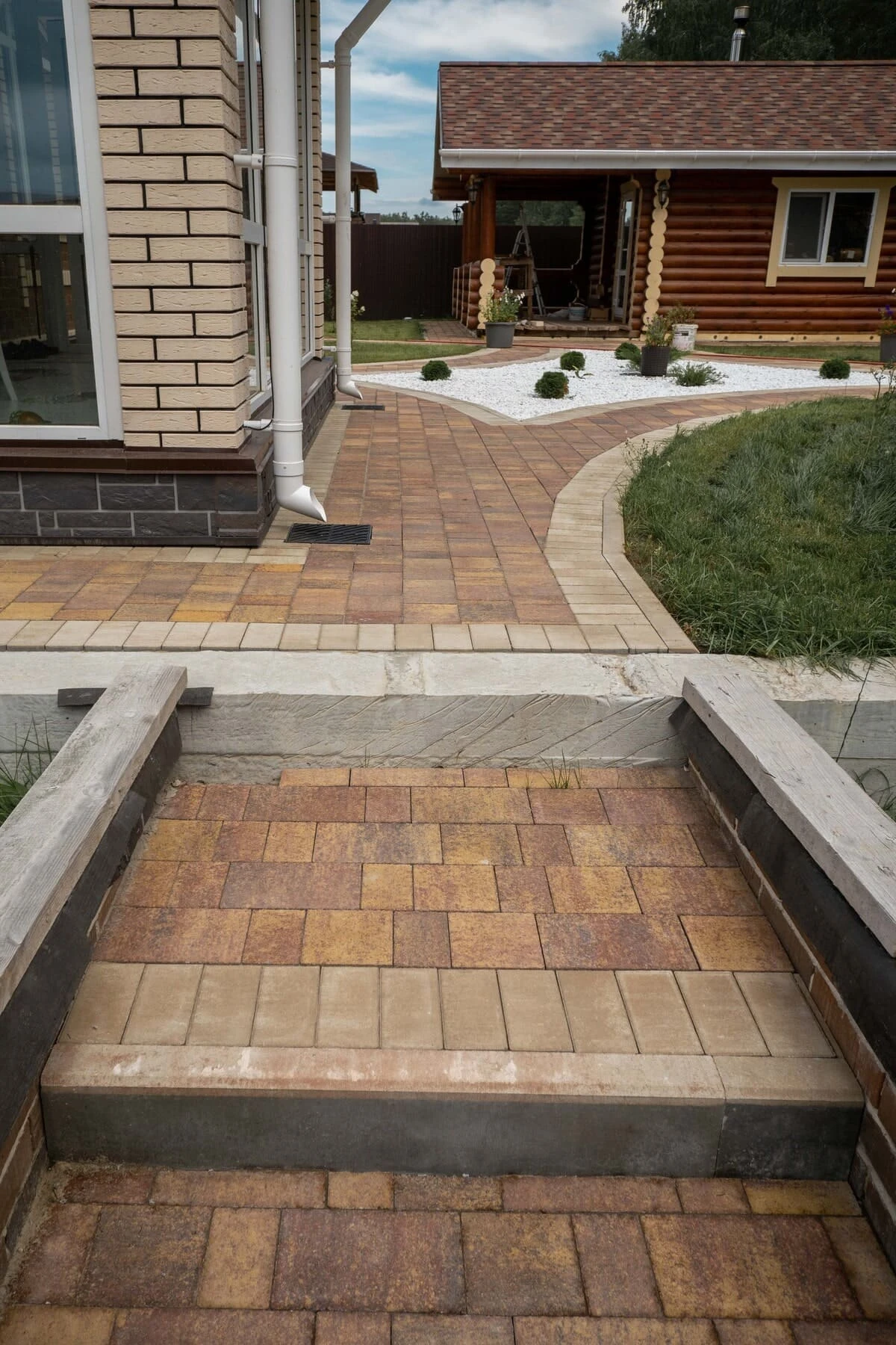 Мощение выполнено двумя тротуарными плитками от завода «Поревит»: «Старый город» в цвете Осень и «Прямоугольник» в цвете Степняк. Для оформления бордюров цвет «Степняк». Все товары представлены ниже и доступны для покупки.
