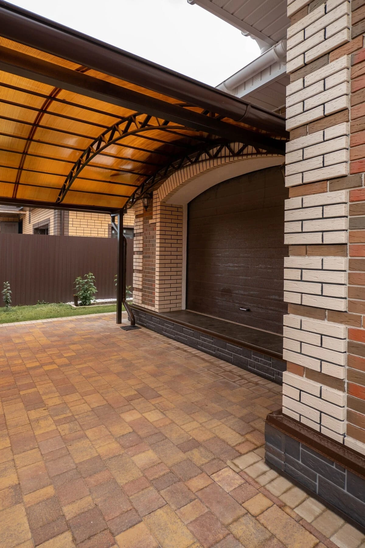 Окантовка мощения выполнена плиткой прямоугольник светло-песчаного цвета Степняк. Выполнено подземное водоотведение с помощью дренажных труб. Прямо на брусчатке установлены скамейки и мангал. Некоторые зоны засыпаны декоративным белым камнем (гравием), там организована посадка растений, часть брусчатки находится под крытым навесом.