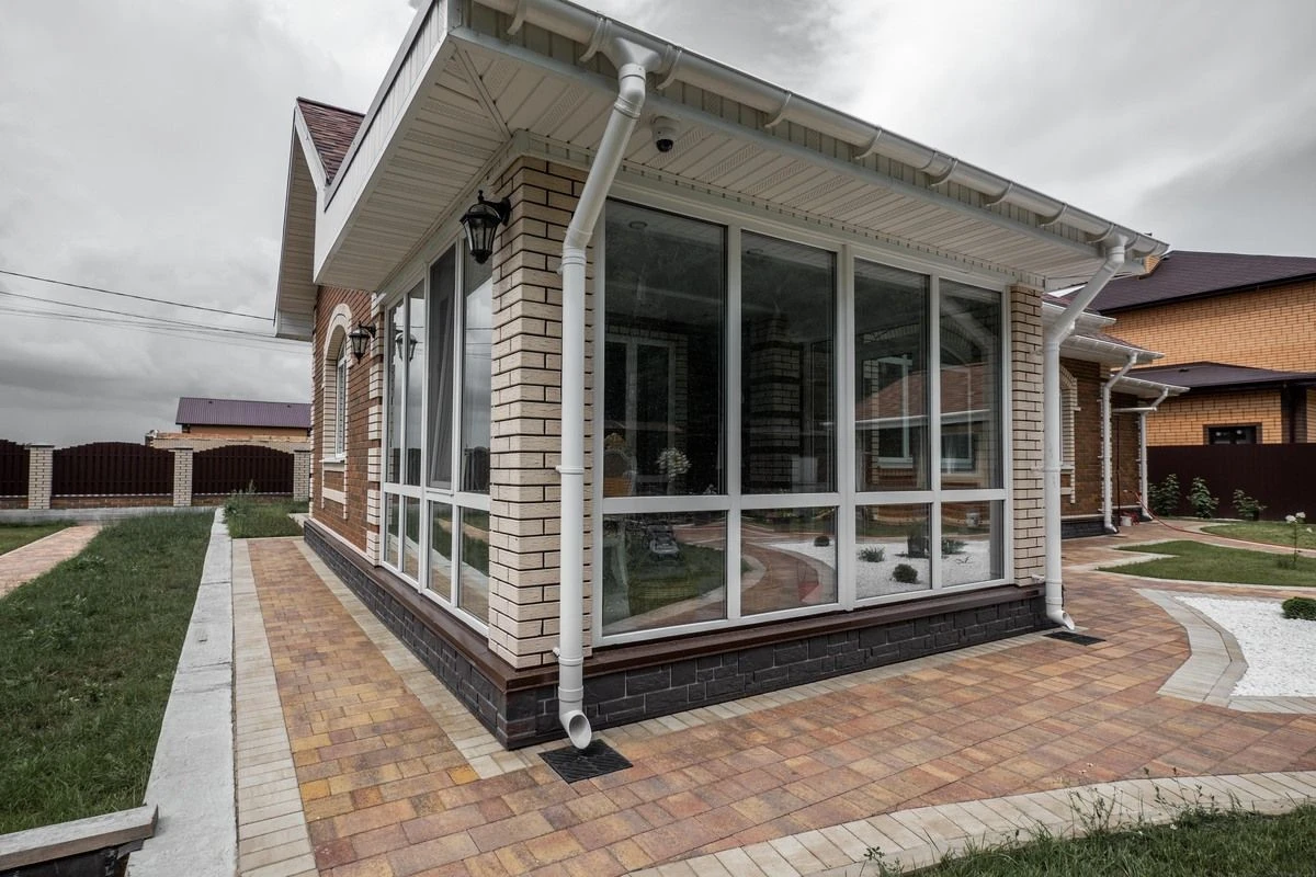 Классическое стилевое решение с сочетающимися между собой блоками позволило благоустроить территорию вокруг дома таким образом, чтобы не оттенять его дизайн, а дополнять архитектурные решения.