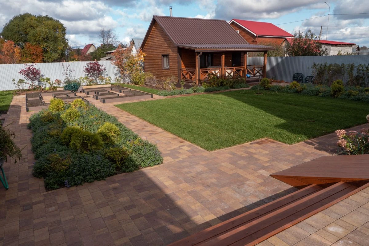• Ландшафтный дизайн участка с укладкой плитки Старый город и Паркет 180х60 в Тюмени