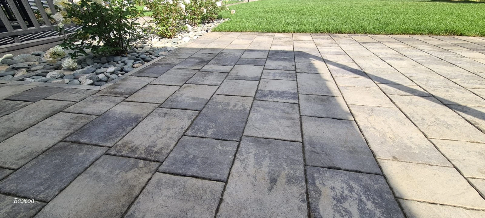 Для этих работ идеально подошли тротуарная плитка Литос в цвете Шунгит, а также бордюры в этом же цвете. Дорожки выполнены в строгом геометрическом формате с прямыми углами, ширина выбрана таким образом, чтобы как минимум два человека могли с легкостью идти рядом или разойтись на дорожке.
