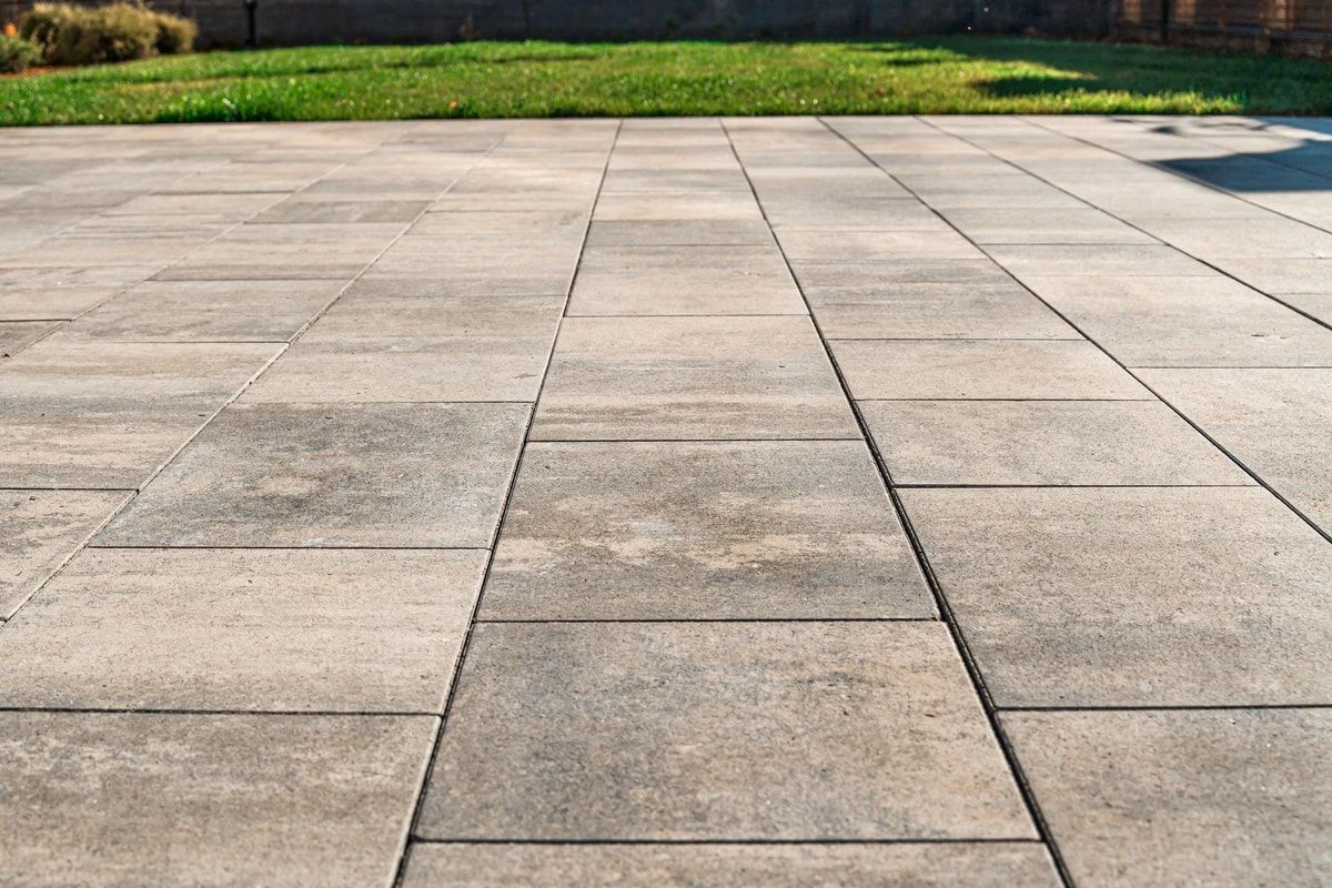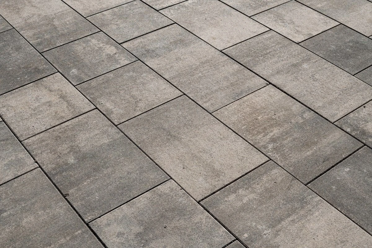 Для мощения территории частного дома была выбрана брусчатка Трио в толщине 60 мм. Комплект состоит из 3-х плит: 300х300 мм, 450х300 мм, 600х300 мм. В результате укладки плитки получается необычный узор. В дополнении к плитке Трио был использован бордюр-поребрик в цвете Габбро.