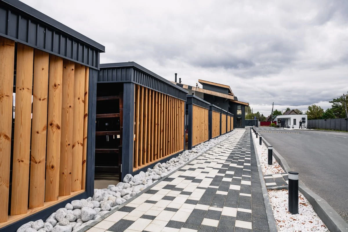 Основной рисунок выстроен с помощью хаотичной разбивки черного и белого цвета, но в местах ближе к дороге или дому плитка переходит в один цвет — черный или белый. Это визуально отделяет прогулочную зону от всех остальных, при этом подобранные цвета гармонируют с постройкой.