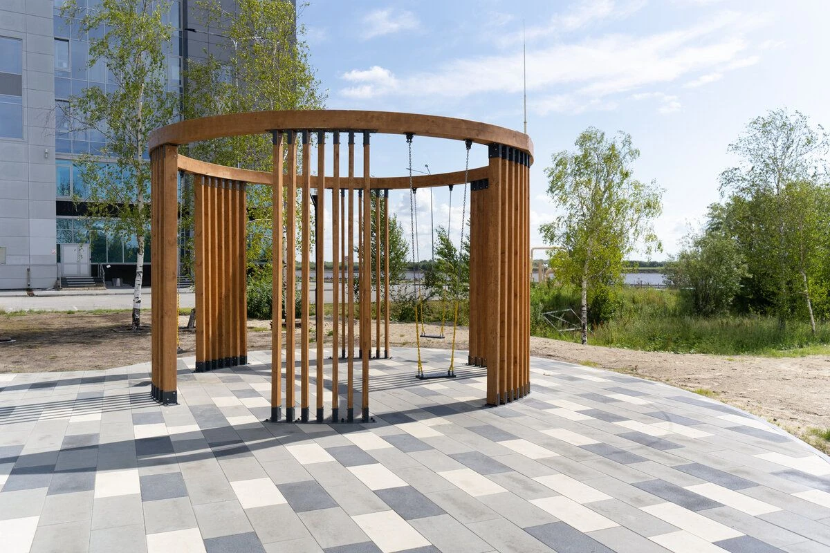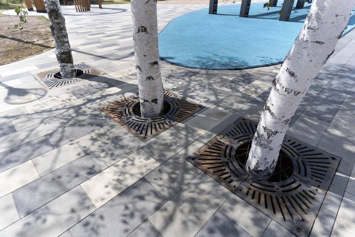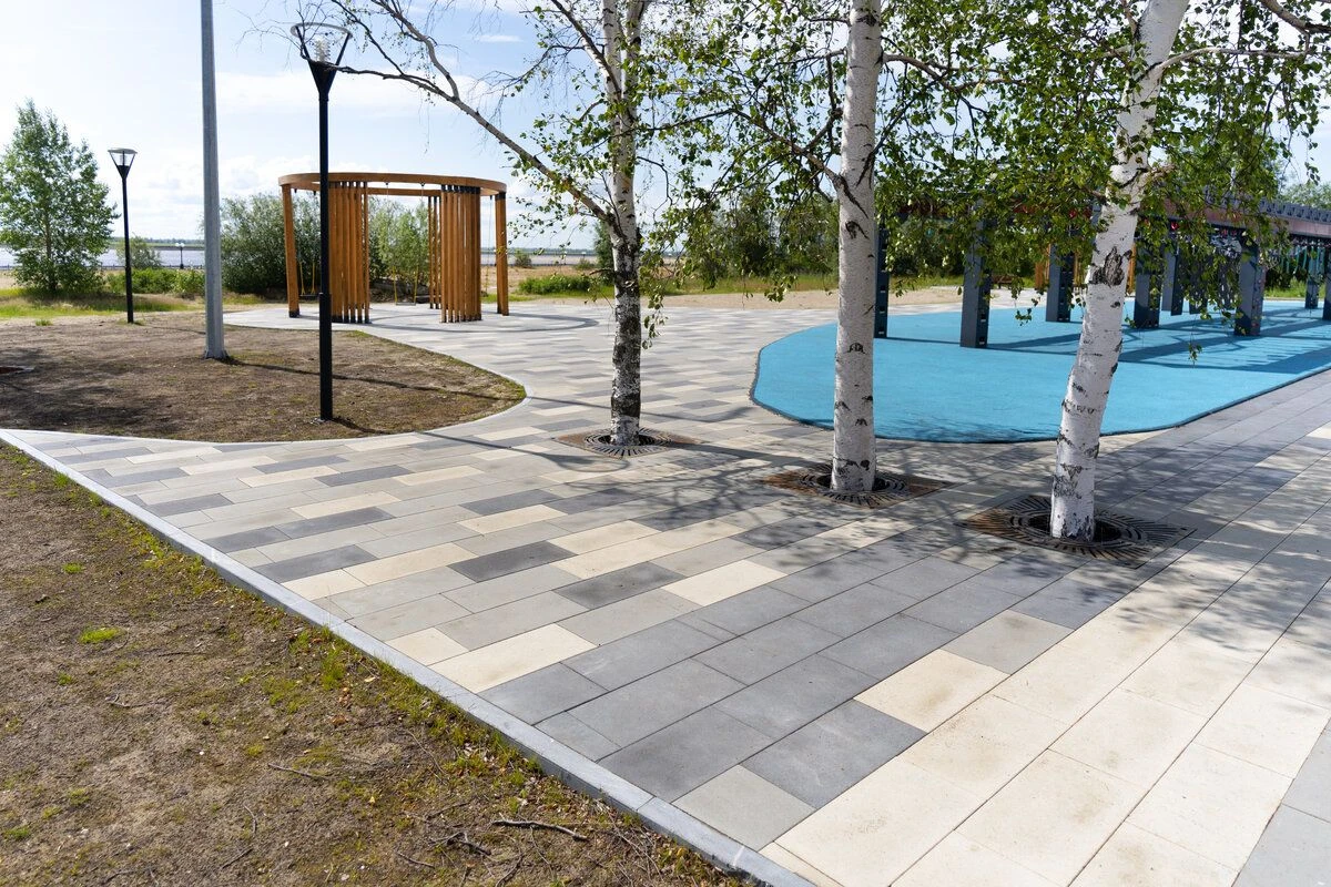 Цвет плитки выбран неслучайно, он сочетается с цветовой гаммой МАФов, березами, а также с протекающей рядом рекой.