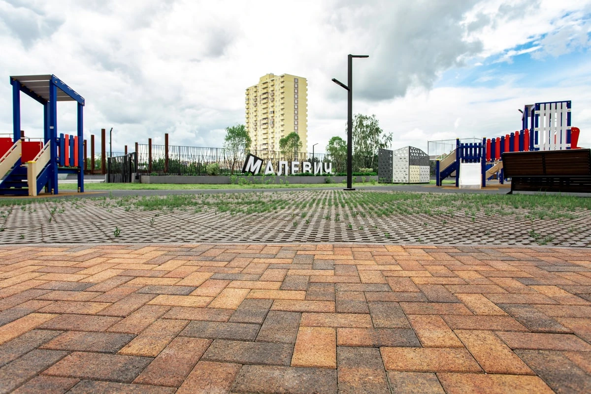 Внутридворовая территория жилого комплекса «Малевич» в Тюмени организована с помощью эксплуатируемой кровли. Она находится на уровне 3 этажа. Здесь размещена дорожно-тропиночная сеть, элементы озеленения, освещение, малые архитектурные формы. Под эксплуатируемой кровлей (двором) находится закрытый паркинг для автомобилей.