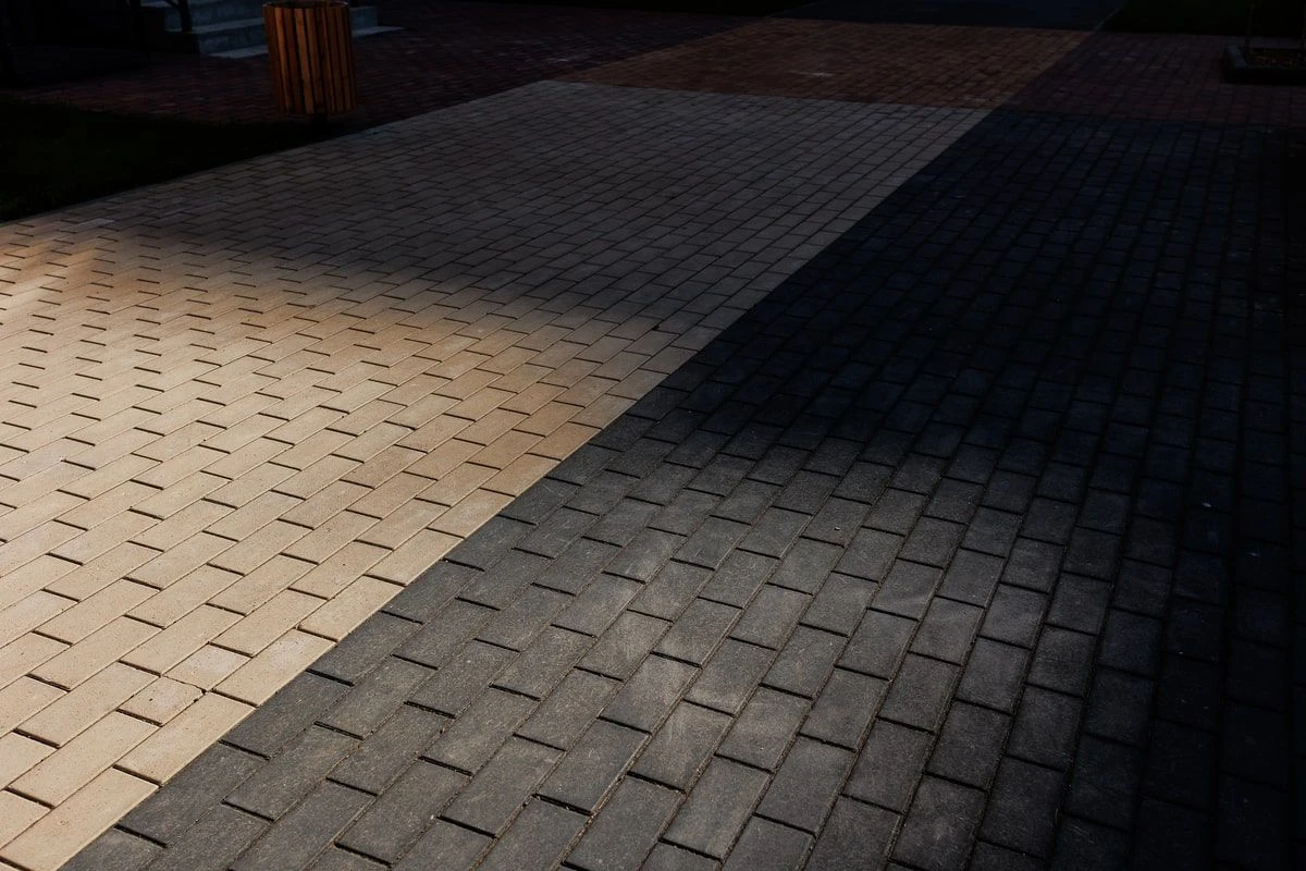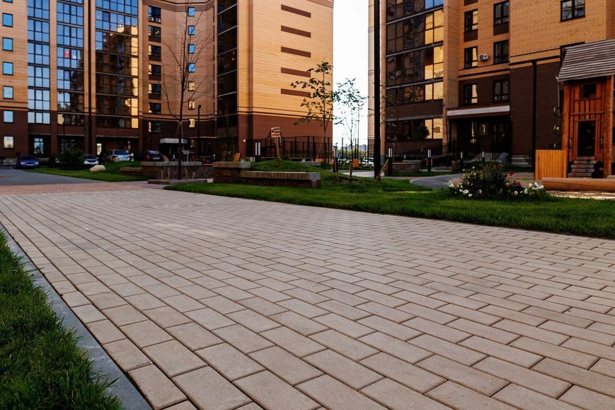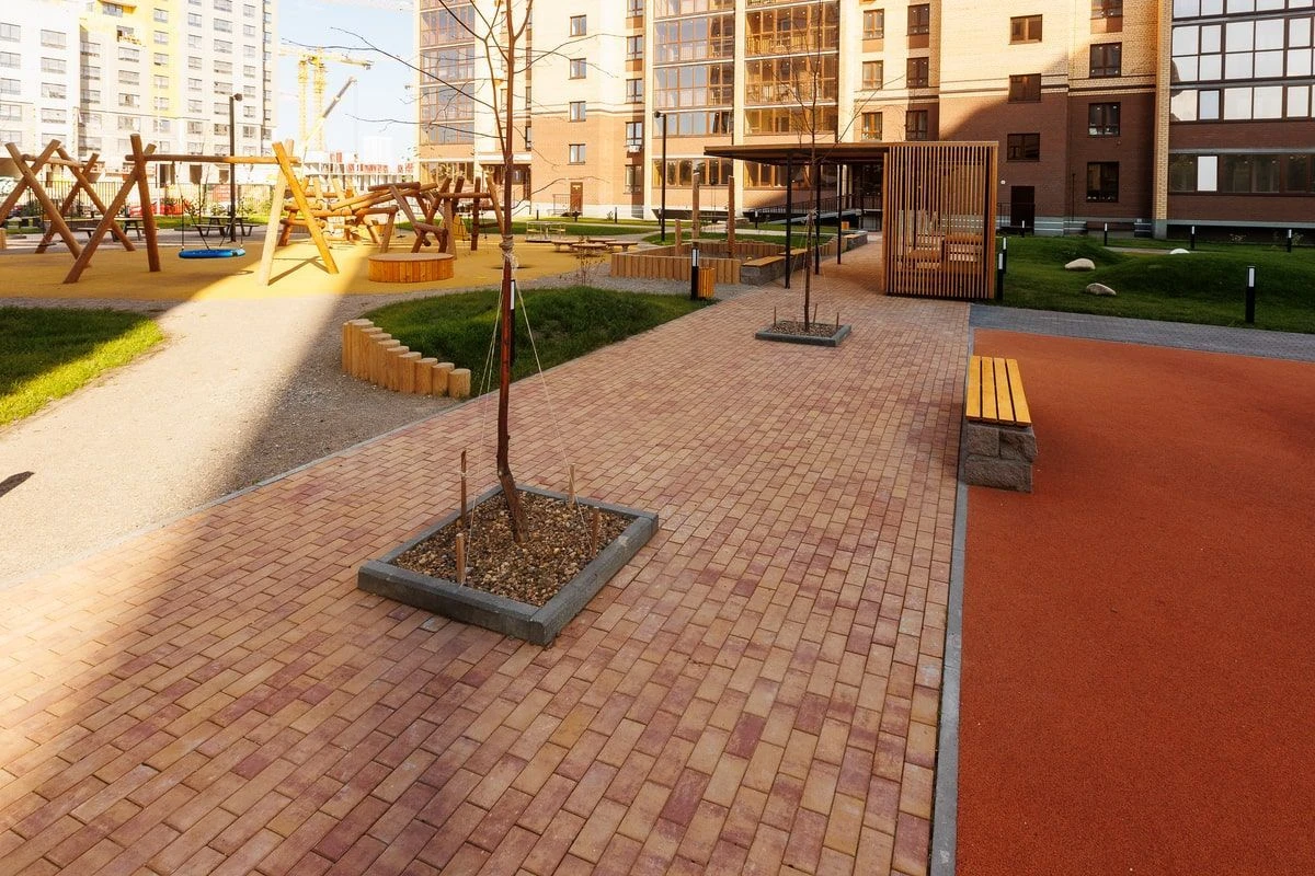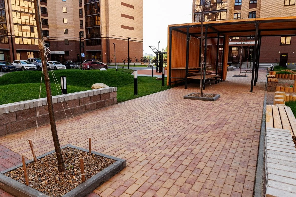 Визуально области не отделяют разные части двора, однако добавляют эффект разнообразия в дополнение к выполненным работам по благоустройству площадки. На проекте используется тротуарная плитка «Поревит» в цветах Белый, Черный, Каир и Клинкер.