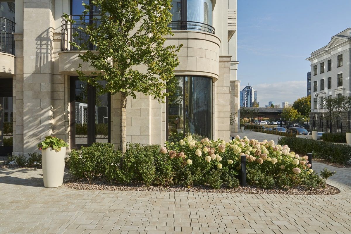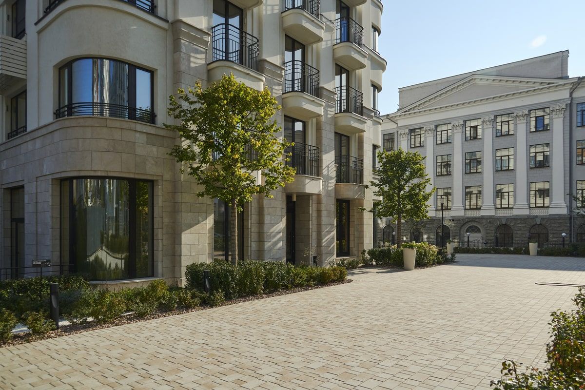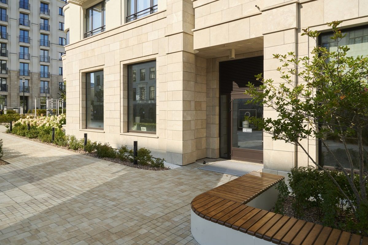 Для благоустройства территории жилого комплекса "На Некрасова" была выбрана плита формы Старый город, в цвете Степняк. А на окантовку Квадрат 100х100 мм. Песчаный цвет идеально сочетается с фасадами домов.