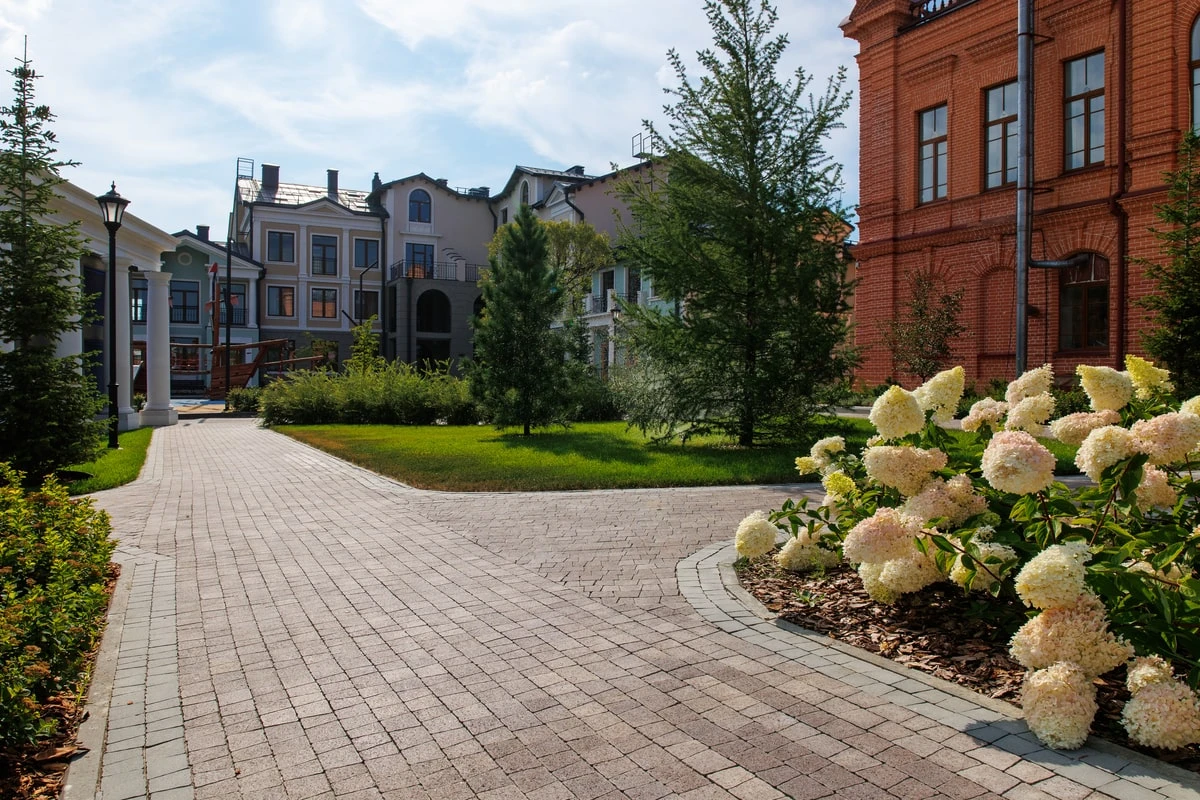 При благоустройстве территории жилого комплекса "Вознесенский" в Тюмени была использована тротуарная плита формы Абрис, в двух коллекциях: гладкий Стандарт и колормикс Гранит цвет Хаски.